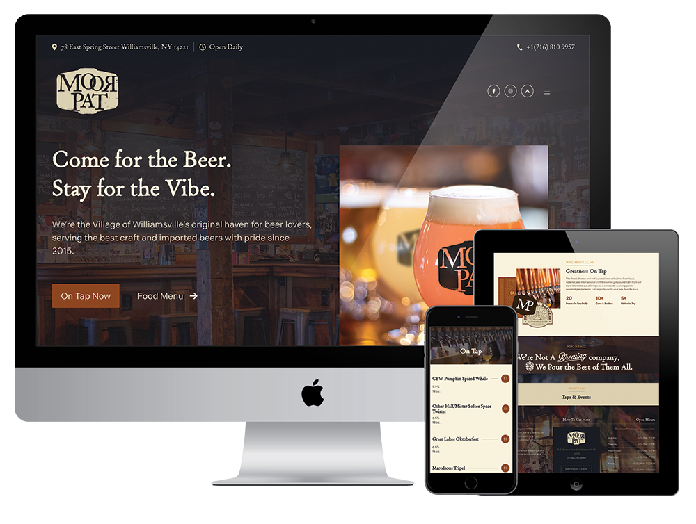 A regional craft beer bar legend and local social hangout located in Williamsville, New York, Moor Pat needed a site that showcased the bar’s relaxed vibe, extensive rotating selection of craft and imported beers on tap. The site also shares the bar’s story, hours, menu sections, and contact information — all wrapped in a friendly, inviting design that reflects the local, community-oriented spirit of Moor Pat. Custom photoshoot to capture the unique architecture and taps, of course.